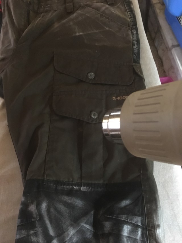 It was time to wax/waterproof my pants and the shoulders on my granite shirt so I grabbed the wax and my heat gun. Putting the wax on is simple. All you have to do is rub the wax on whatever you’re treating like you’re coloring in a coloring book.